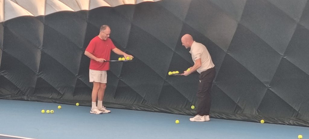 Michael ondersteunt tijdens de lessen en speelt ook mee op de baan, wat bijdraagt aan een ontspannen en veilige sfeer.